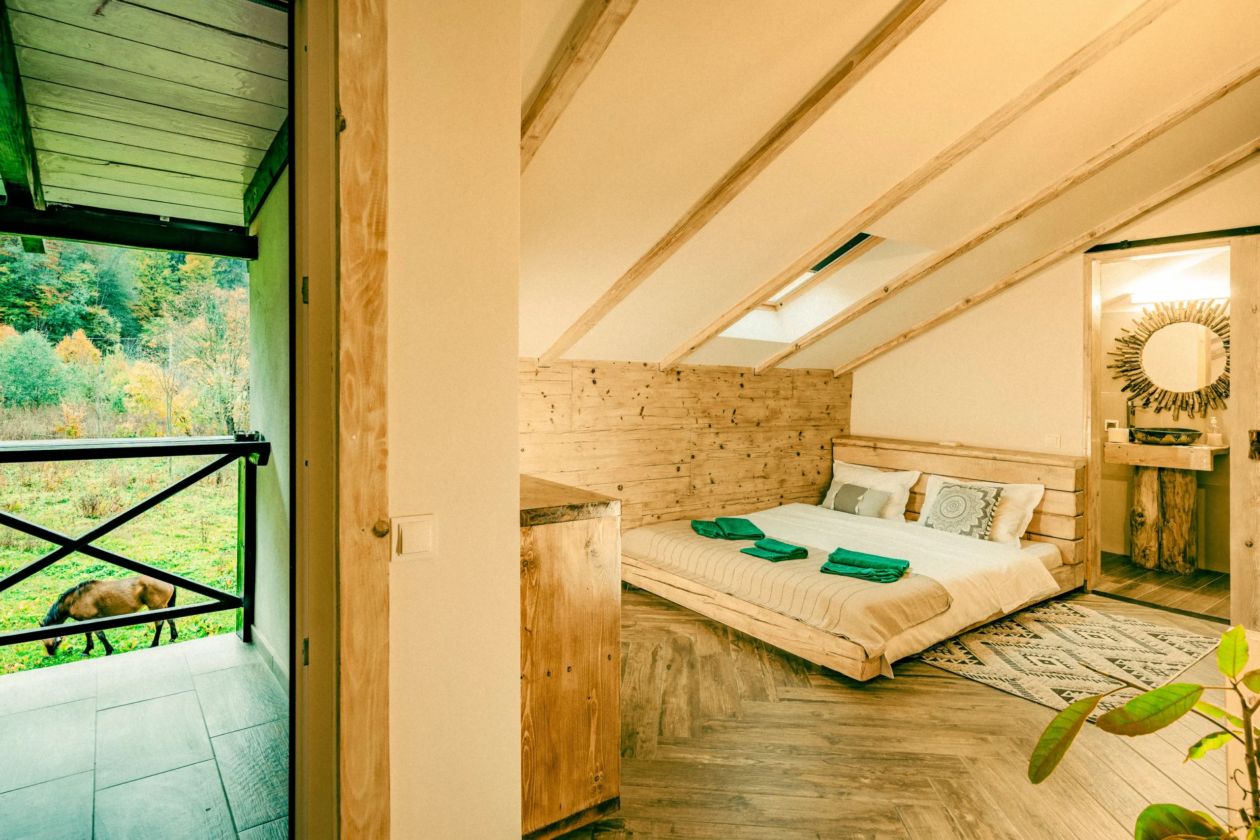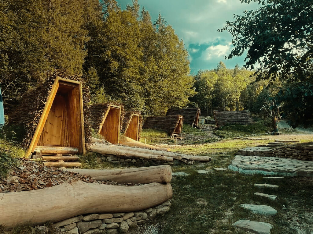Hruba Urșilor — un cuib în inima naturii. Căsuțe pentru două persoane, construite din materiale naturale, unde liniștea se simte în fiecare detaliu. Seara, privești stelele direct din pat, prin fanta de sticlă de deasupra — un spectacol doar al tău, sub bolta nopții.